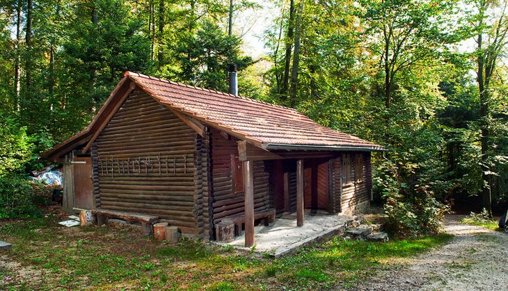 Beim Punkt 787 biegt er links ab und führt hoch auf den bewaldeten Jurarücken. Nach der ersten grossen Linkskurve steht es da: das Jägerhüsli!