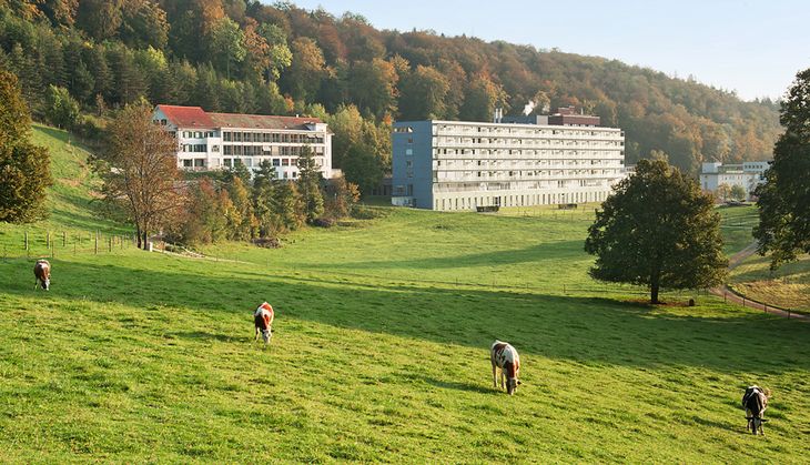 Nach einer kurzen Atempause auf der Bank mit Sicht auf das Klinikgelände beginnt der Abstieg. Er führt Sie zum Stall und – ein spezielles Erlebnis – unter der von der Barmelweid angelegten Geissenbrücke hindurch.